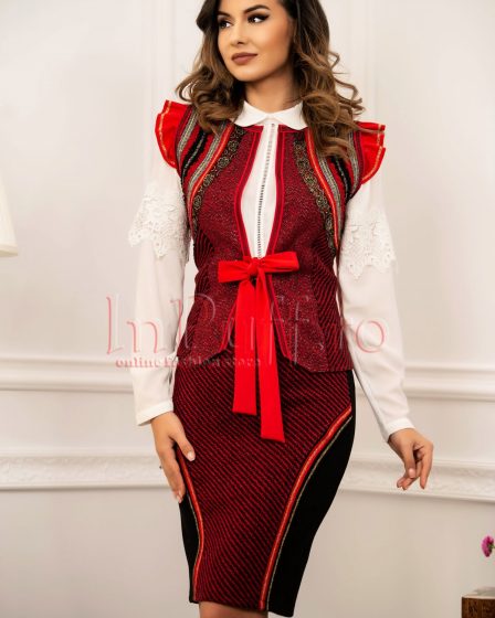 Fusta conica Venezia eleganta de culoare rosie cu fir lame auriu