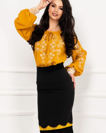 Fusta Venezia neagra conica cu dantela mustar aplicata la terminatie