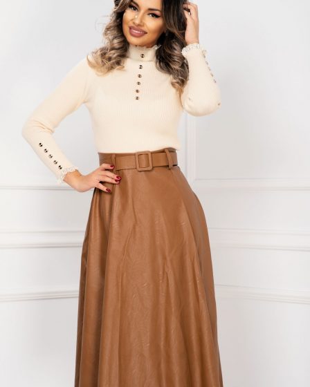 Fusta dama midi camel in clos din piele ecologica si curea in talie
