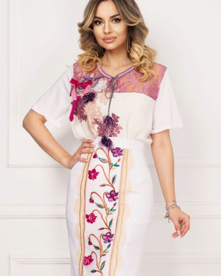 Fusta Venezia conica alba cu flori brodate si dantela aplicata