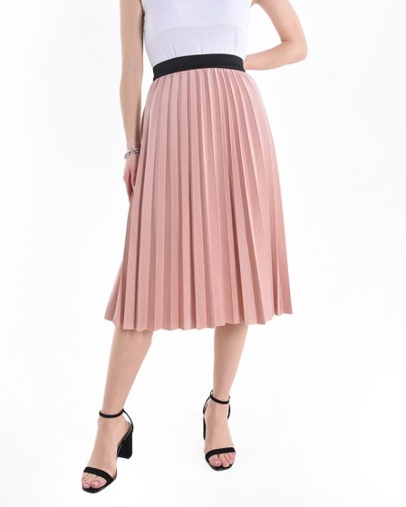 Fusta plisata midi cu elastic negru, roz la 115 lei