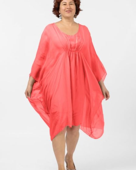 Rochie midi corai, ampla, din matase naturala, cu detaliu sub bust, in colturi la doar 199.99 lei