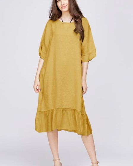 Rochie midi din in galbena cu volane din matase si funda pe spate la doar 229.99 lei