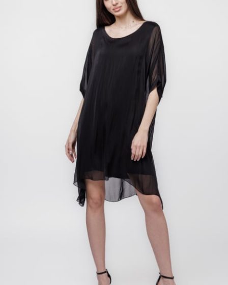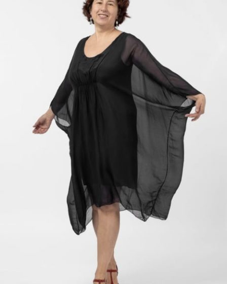 Rochie midi neagra, ampla, din matase naturala, cu detaliu sub bust, in colturi la doar 199.99 lei