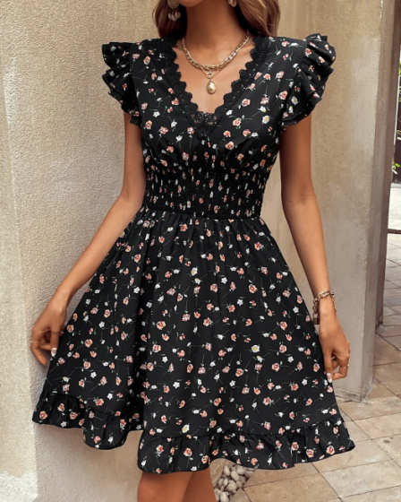 Rochie Dy Fashion neagra cu imprimeu bej si maneci din voal la doar 239 lei