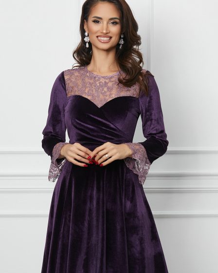 Rochie Dy Fashion mov din catifea cu bust si mansete din dantela la doar 209 lei