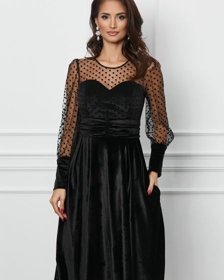 Rochie Dy Fashion neagra din catifea si tull cu buline la bust la doar 217 lei
