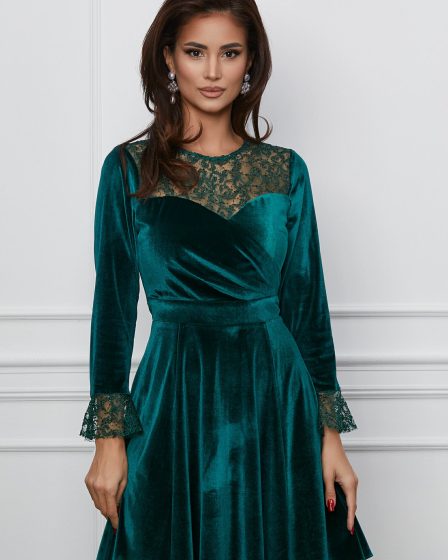 Rochie Dy Fashion verde din catifea cu bust si mansete din dantela la doar 209 lei