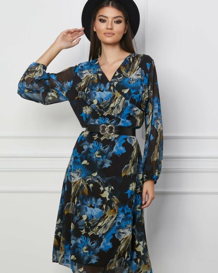 Rochie Loredana neagra cu imprimeu albastru si curea in talie la doar 217 lei