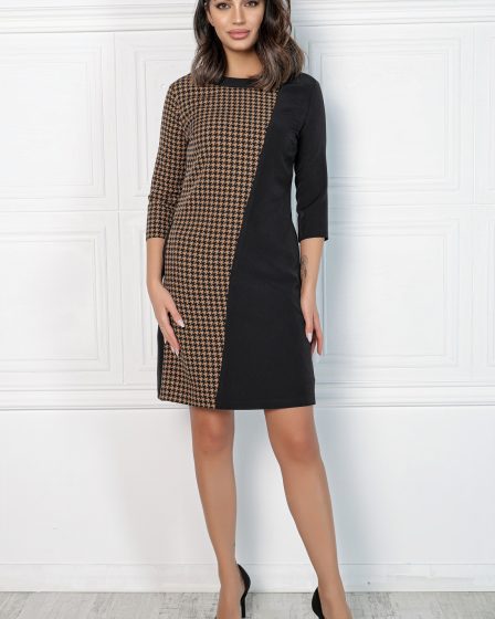 Rochie Dy Fashion neagra cu imprimeu maro pe maneci la doar 239 lei