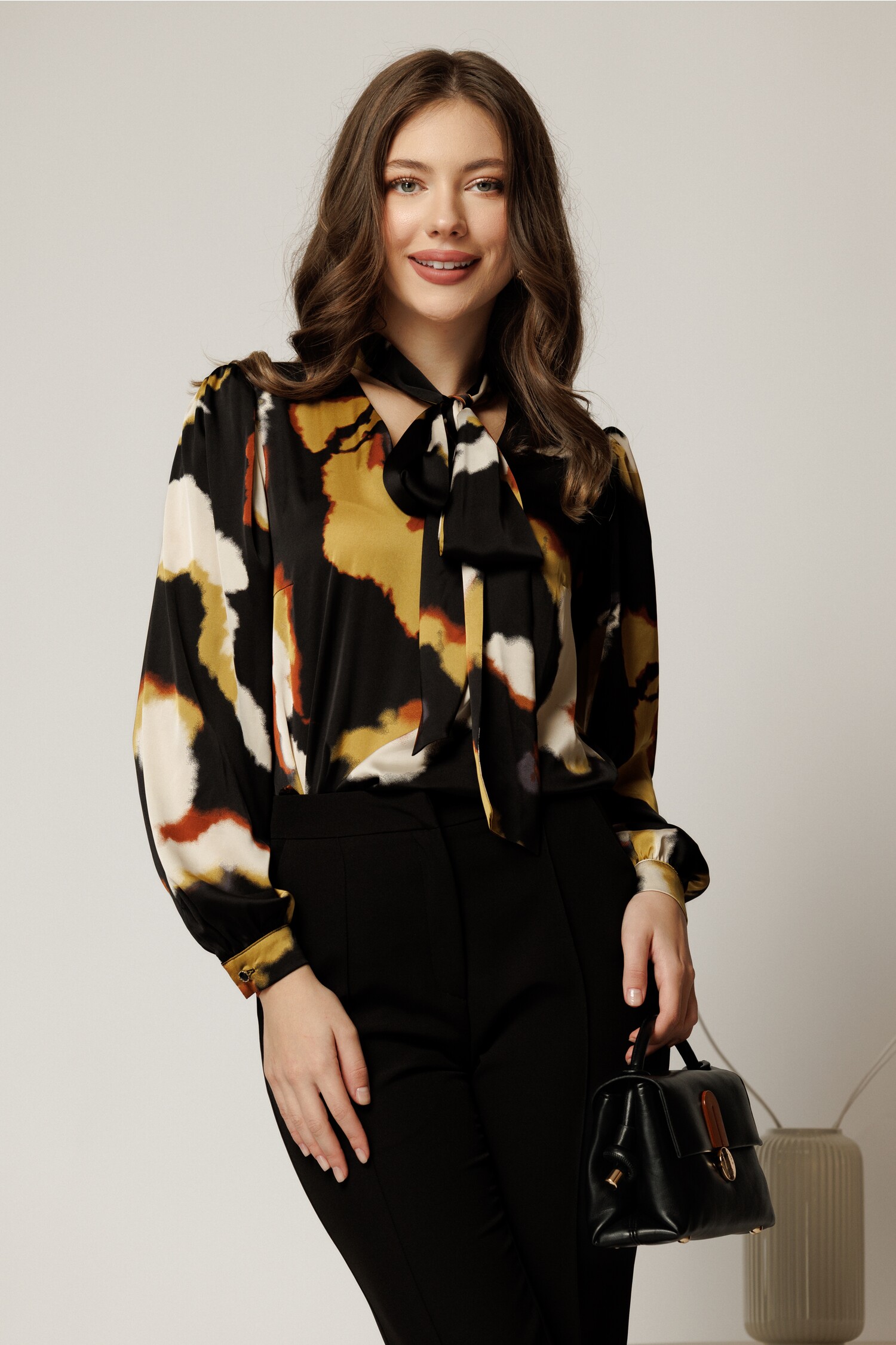 Detalii si descriere Bluza dama din satin in nuante de negru si maro cu funda la guler: