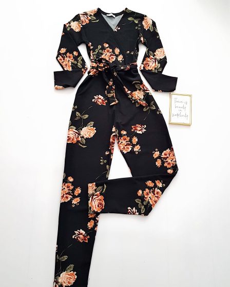 Salopeta dama casual lunga neagra cu imprimeu flori corai si cordon in talie la 129 lei