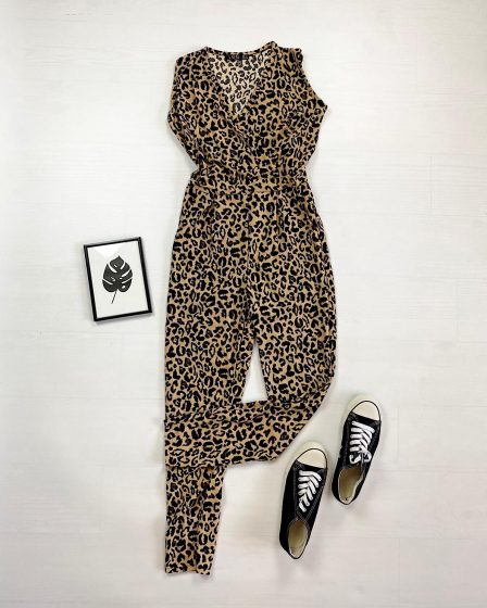Salopeta dama casual lunga animal print cu decolteu parte peste parte la 129 lei