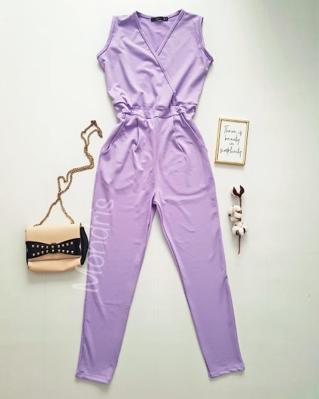 Salopeta dama casual lunga mov cu decolteu parte peste parte la 129 lei