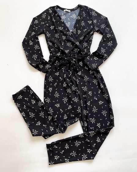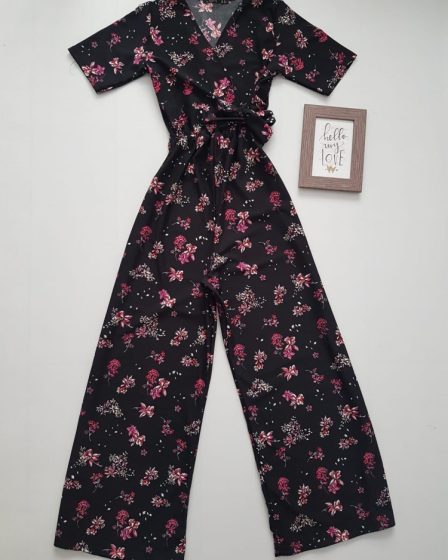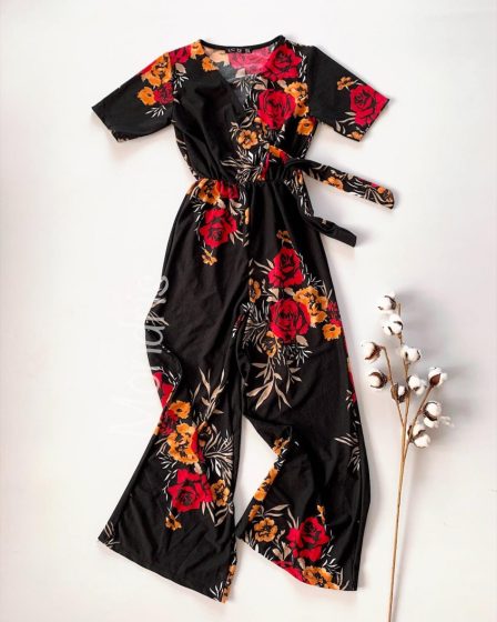 Salopeta dama casual neagra cu maneca scurta cu imprimeu flori mici si cordon in talie la 129 lei