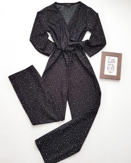 Salopeta dama casual lunga neagra cu imprimeu puncte si cordon in talie la 129 lei