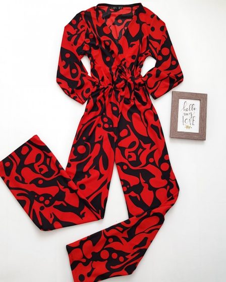 Salopeta dama casual lunga rosie cu imprimeu patat negru si cordon in talie la 129 lei