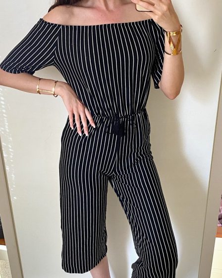 Salopeta dama casual midi neagra cu imprimeu dungi si umerii goi la 59 lei